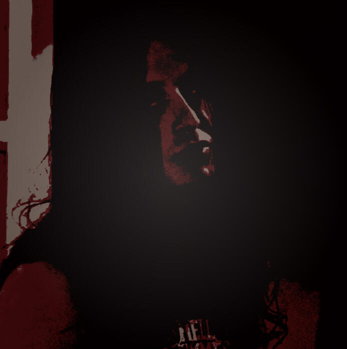 detail three he has burn marks that scatter across his face from being lit on fire and poured with alchohol, it runs across the bottom right all the way up to his left side up, burning his ear and into his scalp. though his nose has also been burned but saved in a sense. the skin there is ragged, and his nostrils have been visibly cut open.